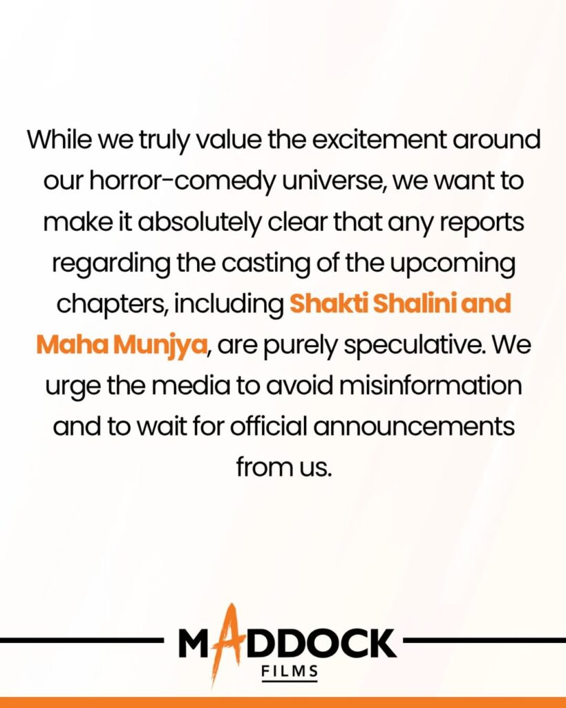 दरम्यान, मॅडॉकच्या आगामी ‘शक्ती शालिनी’ या चित्रपटात सैयारा फेम अनित पड्डा मुख्य भूमिकेत झळकणार असल्याच्या अफवा गेले काही दिवसांपासून जोर धरत होत्या. यावर आता खुद्द मॅडॉक फिल्म्सनेच मौन सोडले आहे. त्यांच्या अधिकृत इंस्टाग्राम हँडलवर पोस्ट शेअर करत त्यांनी लिहिले की, “आमच्या हॉरर-कॉमेडी विश्वाभोवती असलेल्या उत्साहाची आम्ही खूपच कदर करतो, पण ‘शक्ती शालिनी’ आणि ‘महा मुंज्या’ यासारख्या चित्रपटांच्या कलाकारांबाबत सध्या फिरणाऱ्या बातम्या पूर्णपणे अनुमानावर आधारित आहेत. कृपया आमच्या अधिकृत घोषणांची वाट पहा.” यातून स्पष्ट झाले आहे की, या अफवांमध्ये तथ्य नाही.